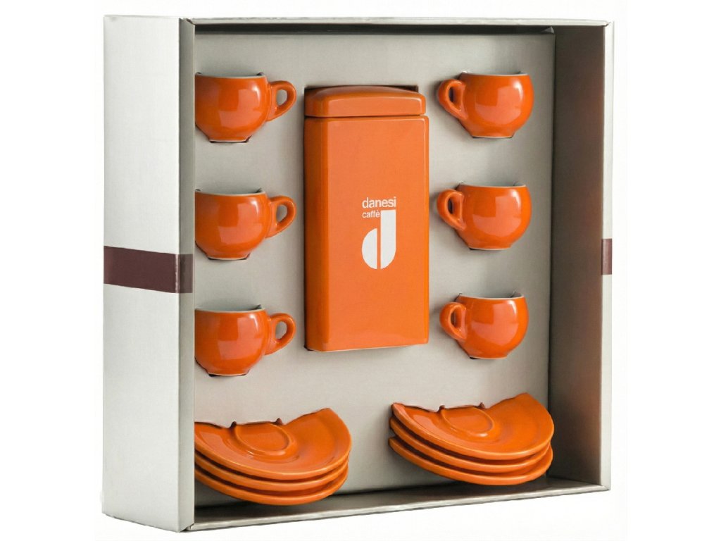 Danesi La Forma Gift Pack - Dark's Cassette Kava 250g + 6 espresso cups and 6 saucers - orange