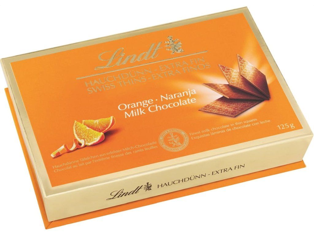 You don't have to wait for this treat. The uniquely thin slices masterfully combine the velvety taste of Swiss milk chocolate with the fresh sparkle of orange. They are the perfect way to make your day more enjoyable, especially when combined with a cup of good coffee or tea. And as a beautiful gift? Guaranteed to please.
